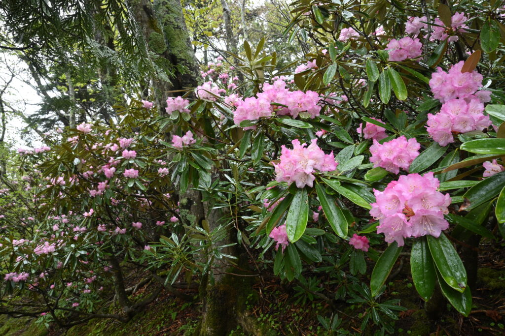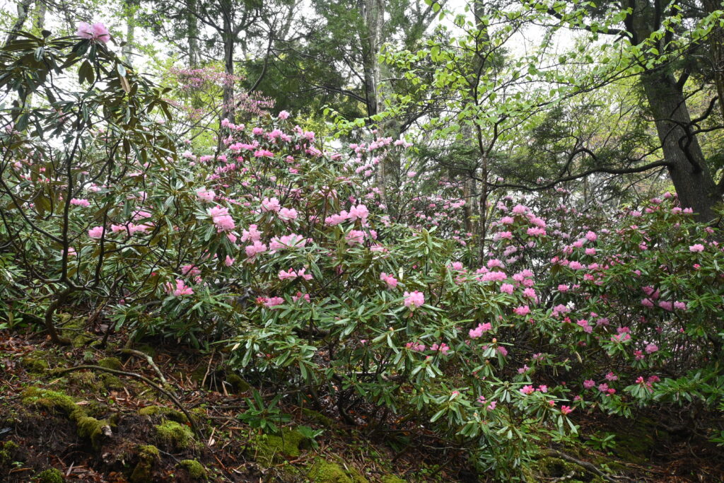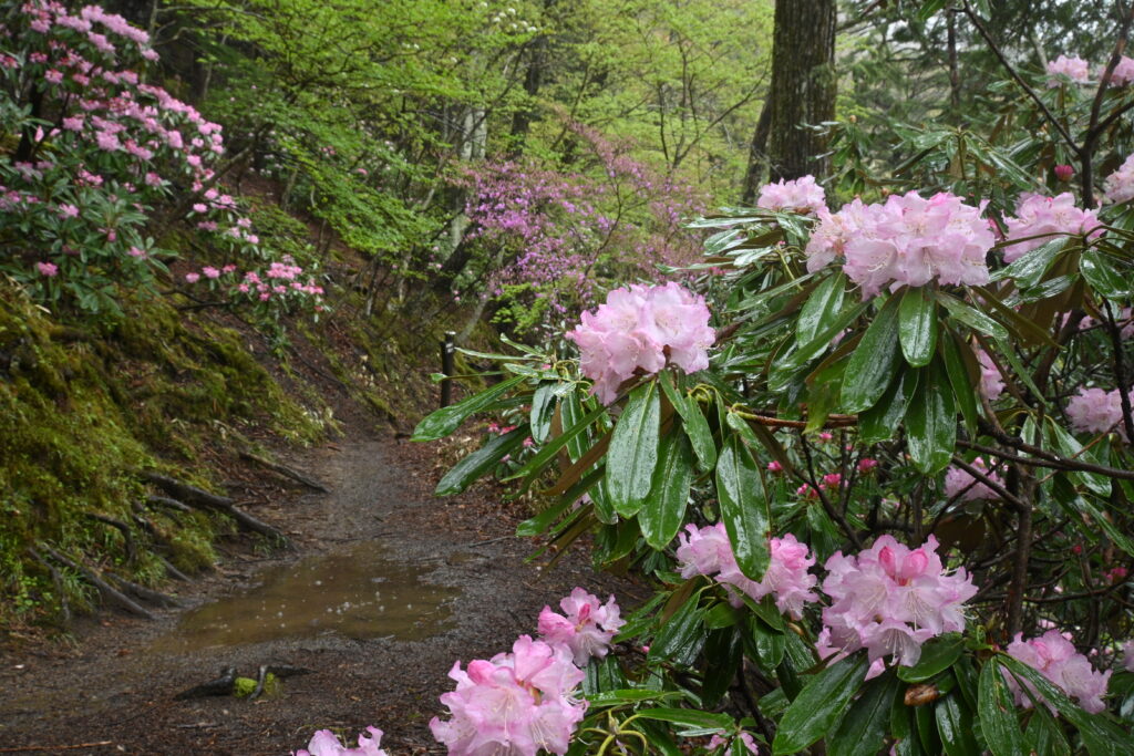 両側にシャクナゲが生える箇所も!湯ノ湖のアズマシャクナゲは今がピークです。今週中は見頃が続くと思いますが、ぜひお早めにご覧ください!!