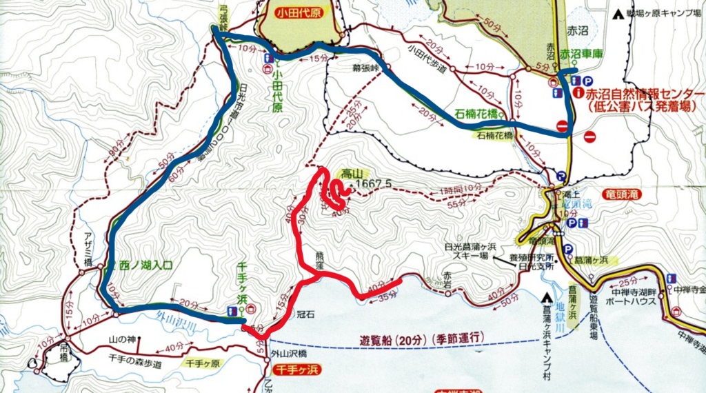 今回歩いたコースは赤色のマーカー部です。このコースですと高山頂上付近のツツジの群落にたどり着くまで、登り続きとなりますのでご注意ください。