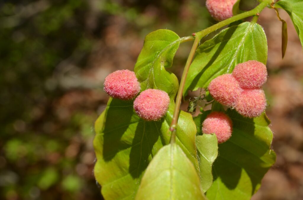 とても美しいですよね!じつはこれ、ブナハアカゲタマフシという虫こぶなんです。ブナの若葉に多く見られます。