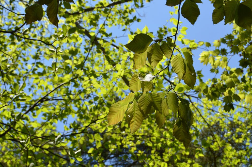ブナは他の樹木に比べ比較的葉がペラペラしていて薄いです。そのため、特に若葉は透明度が高く日光をよく通すので、淡い優しい黄緑色になりとても美しいんです。