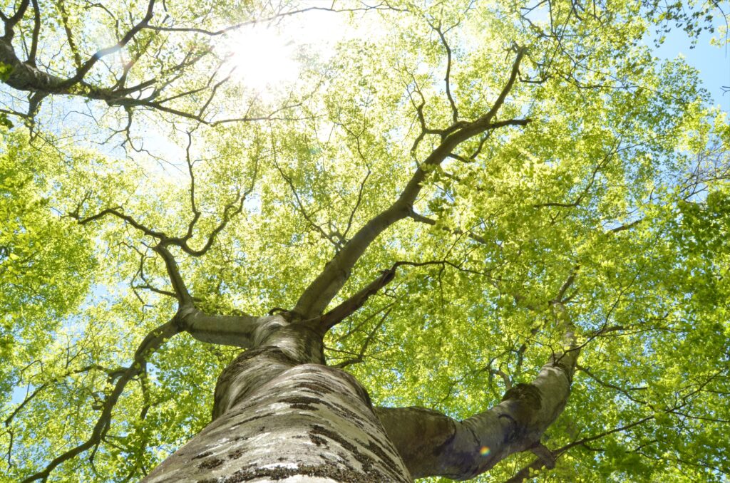 木にもたれかかることで、葉だけではなく枝が視界にはいります。太くて、遠くまで伸びている立派な枝ぶりもセットに見ると迫力があって良いですよ。また、ブナの木に寄りかかると白っぽい樹皮が美しく、絶景です!