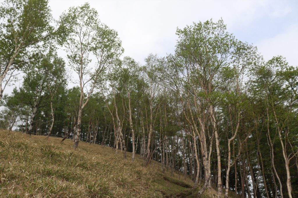 駐車場から登ってすぐ。ダケカンバの林が見えるのですが、葉が芽吹いていてとてもきれいでした!