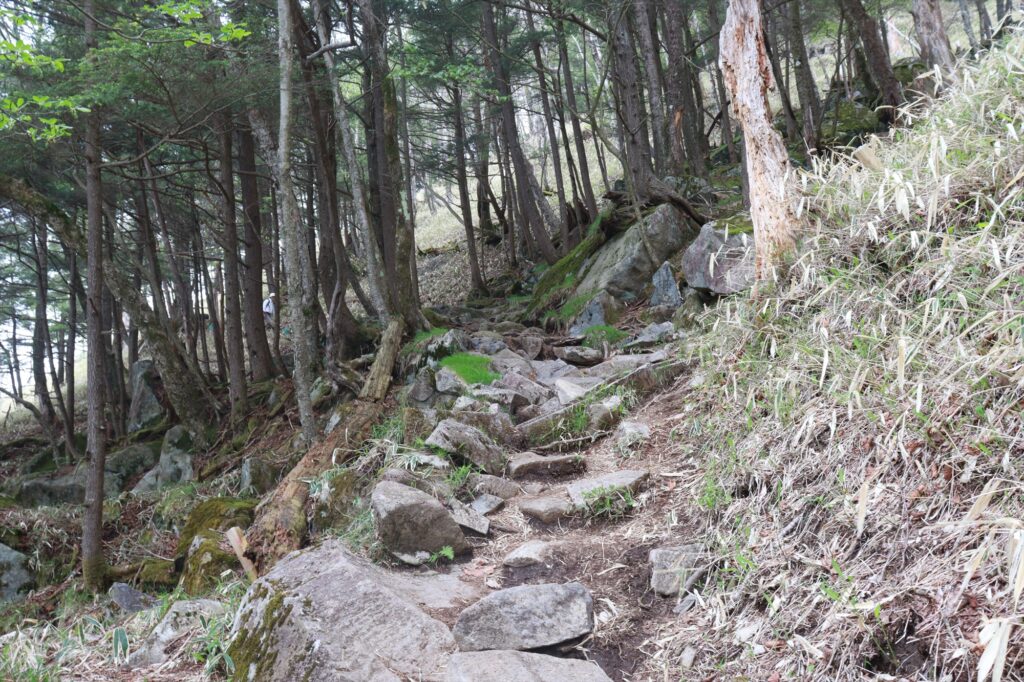 そして、展望台から社山方向へ10分程歩くと、斜面を下る道がでてきます。
