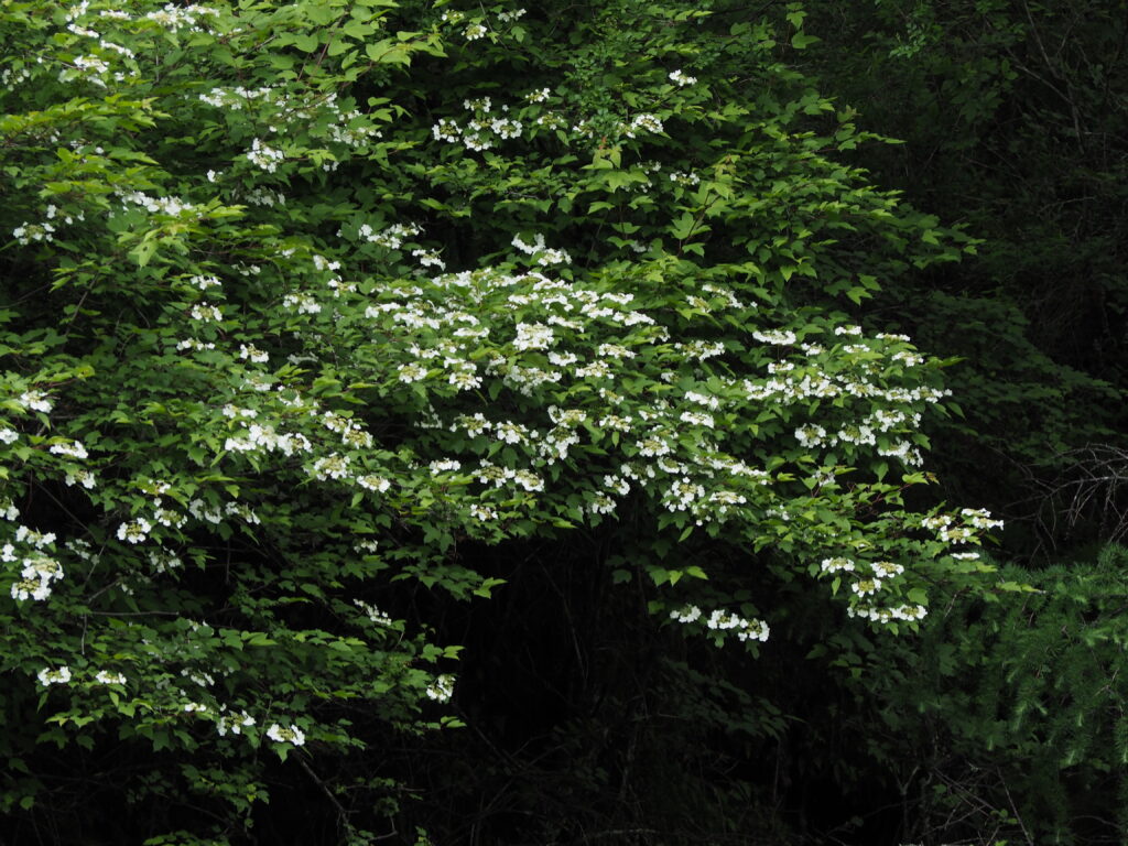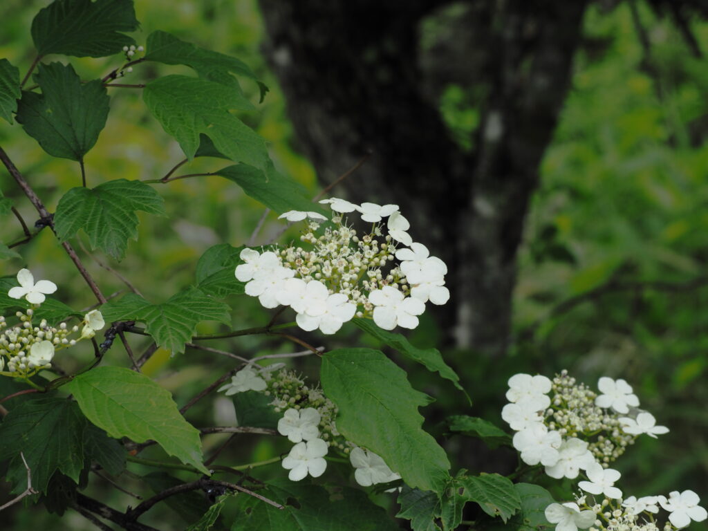 アジサイのような白い花の、カンボク。カエデのように3枚に切れ込んだ葉っぱが特徴です。