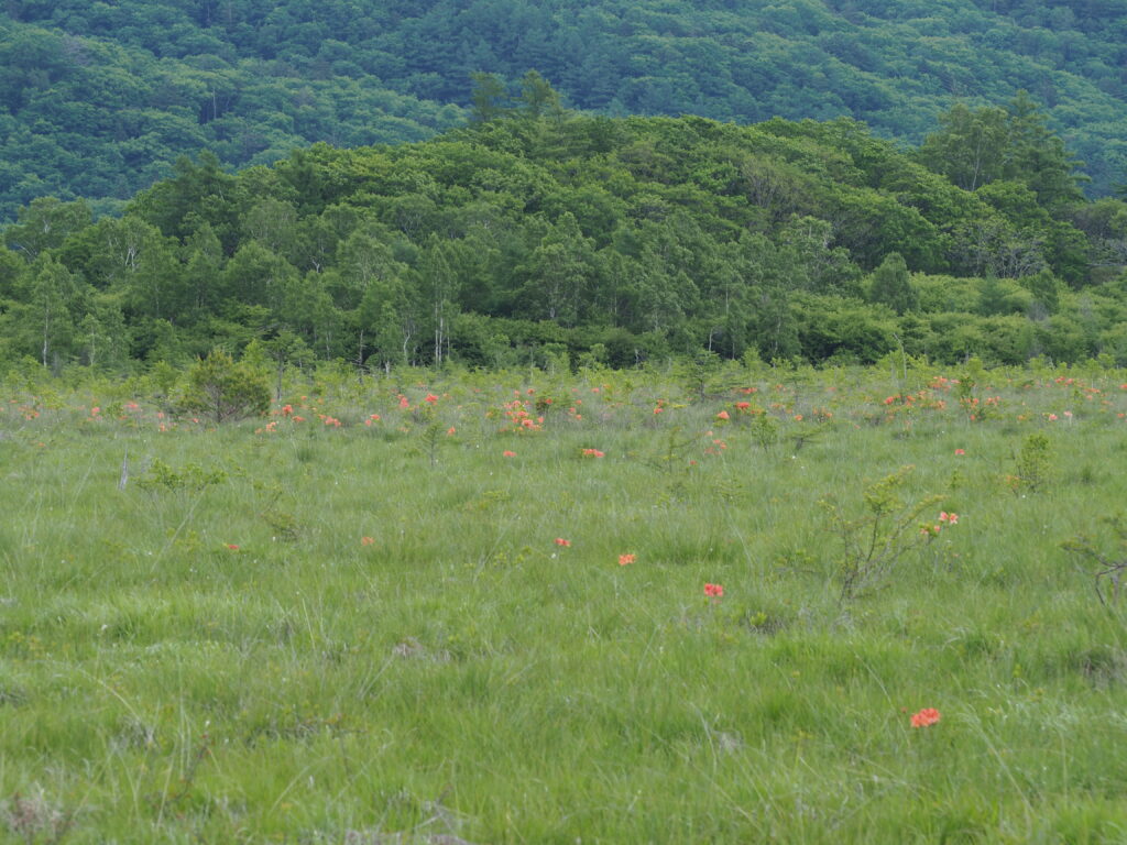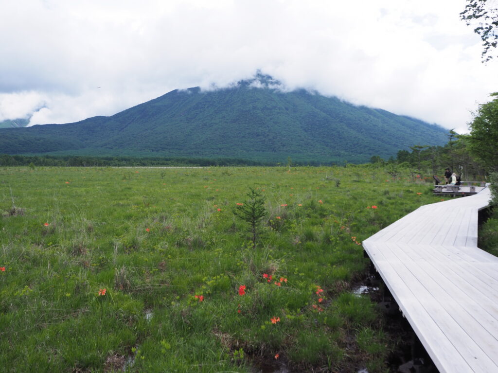 赤沼から徒歩40分ほど、戦場ヶ原の展望台から眺めると、青々としてきた湿原に、オレンジ色が目立ちます。