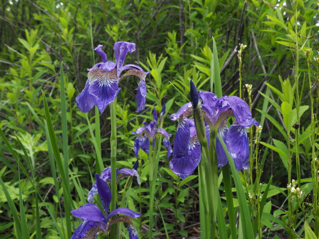 木道沿いの足元には、紫色が目に眩しいアヤメ。