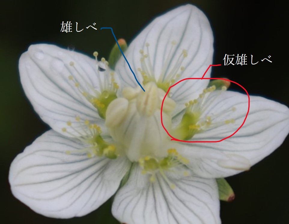 ウメバチソウの写真を見返していたら、上の写真は、5本の雄しべが真ん中にある雌しべを包むような状態だったのですが、下の写真では、雄しべが外向きに反り返っていたのです。