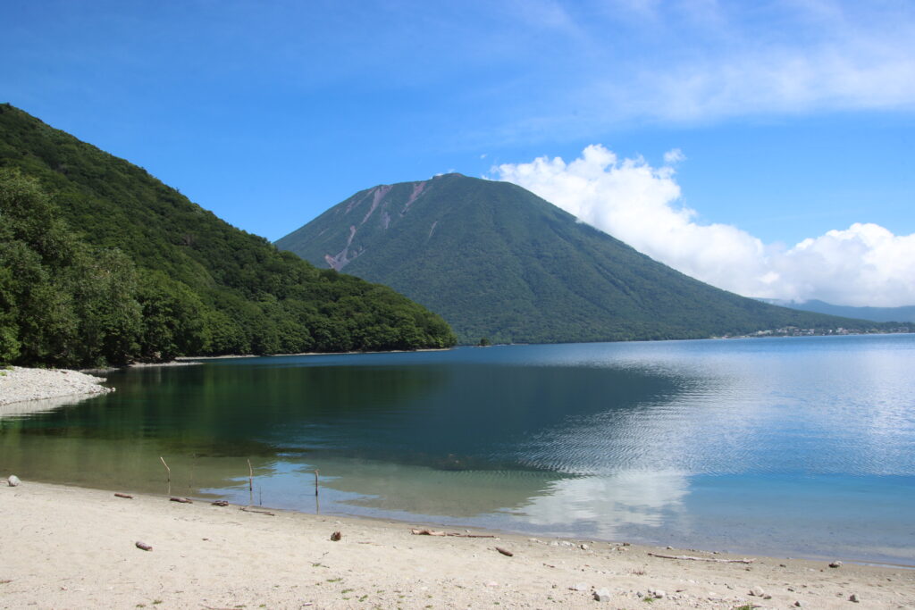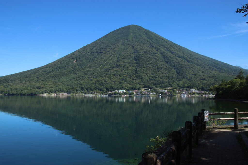 サファイアのような深い青の中禅寺湖の上に男体山が堂々とそびえていました!空は澄み切った秋の空で、中禅寺湖の青と合わさって男体山の雄大さをより一層引き立てていました。