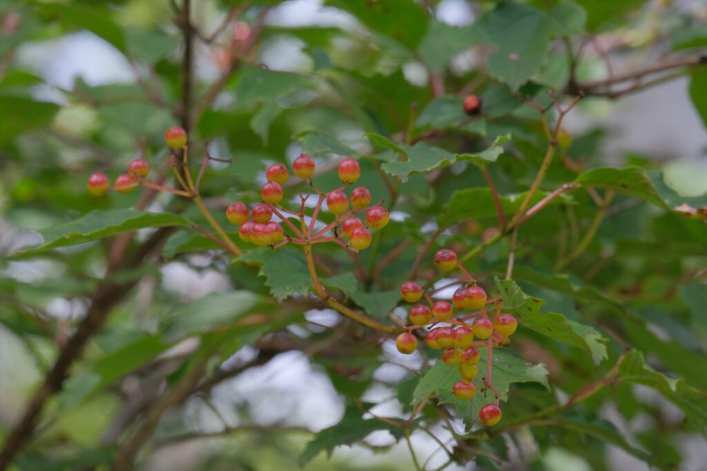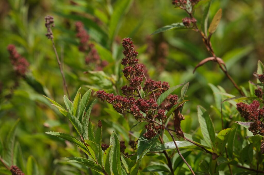 夏の盛りにはピンクのお花畑を見せてくれたホザキシモツケも、実が熟して赤みが増してきました。