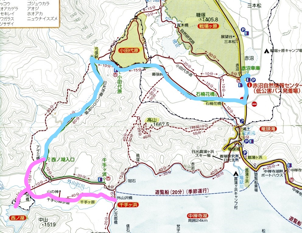 「赤沼車庫」から「西ノ湖入口」までは乗車時間25分、「西ノ湖入口」から西ノ湖までは徒歩25分、