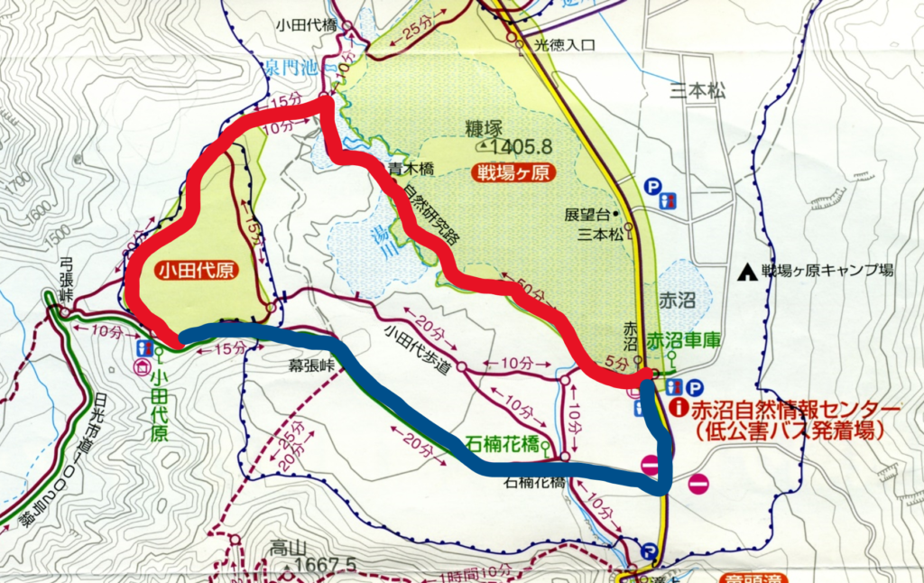 今回歩いたコースは赤マーカー部です。小田代原までは赤沼自然情報センターから出発している低公害バスを利用するとお手軽にアクセスできますよ!詳しくはこちら