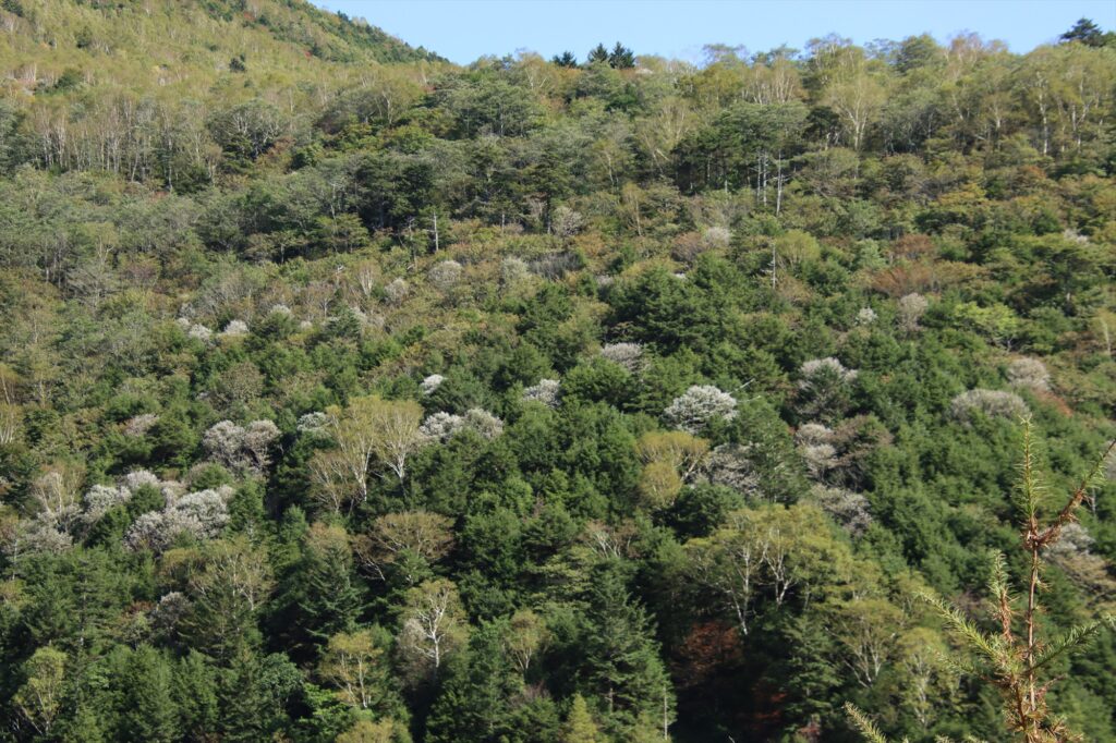 まだまだ、緑が優先といった感じですが目線より少し高いところ(標高約1800~1900mほど?)のところで赤、オレンジ。黄色に染まっている木がちらほら。