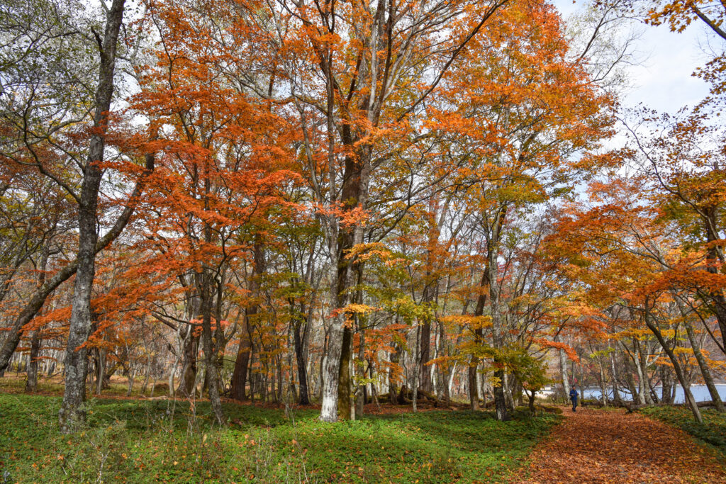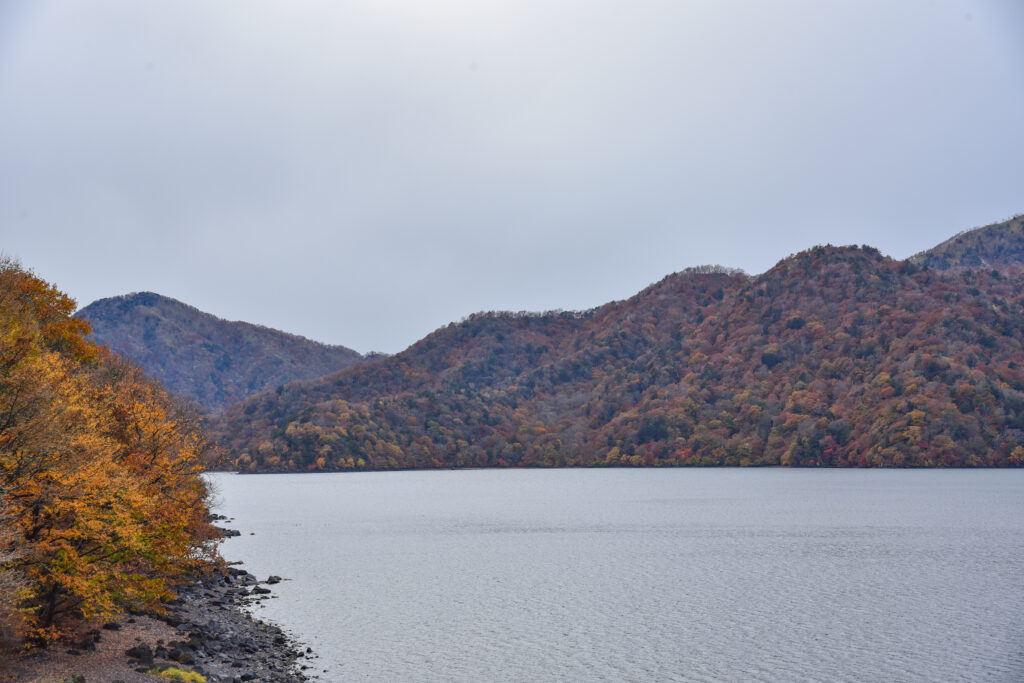 続いては西ノ湖です。湖のバックはかなり茶色が目立ち始めてはいますが、わずかに色が綺麗な箇所が残るほか、