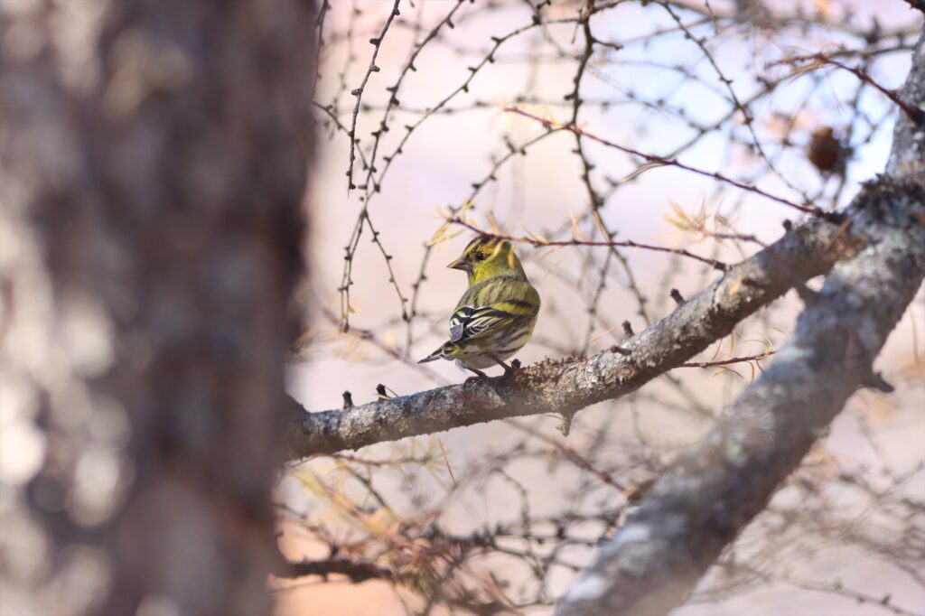 マヒワ♀ メスはオスより淡い黄色で、お腹に縞模様があります。
