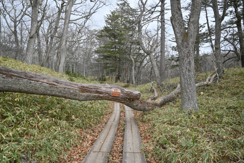 ここから泉門池まで再び森の中を歩いて行きますが、小田代橋を越えた先で大きな倒木が木道を塞いでいました。