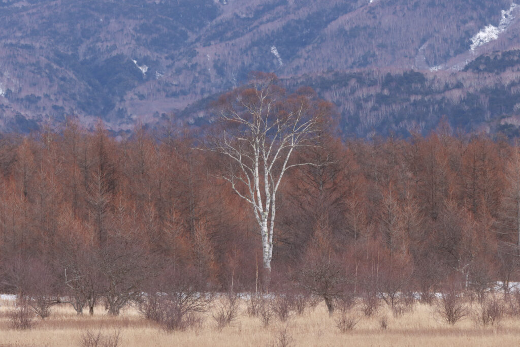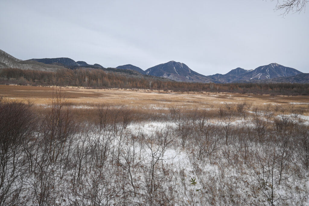 小田代原の地面は雪で覆いつくされていますが、植物が埋もれる程ではなく枯れ草や葉が落ちた木々に雪の白が加わって、コントラストのある美しい風景を演出していました。