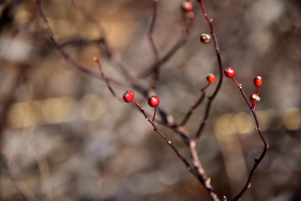 他にも、雪が積もり景色がモノクロのようになったことで鮮やかな赤色をしたカンボクの実や