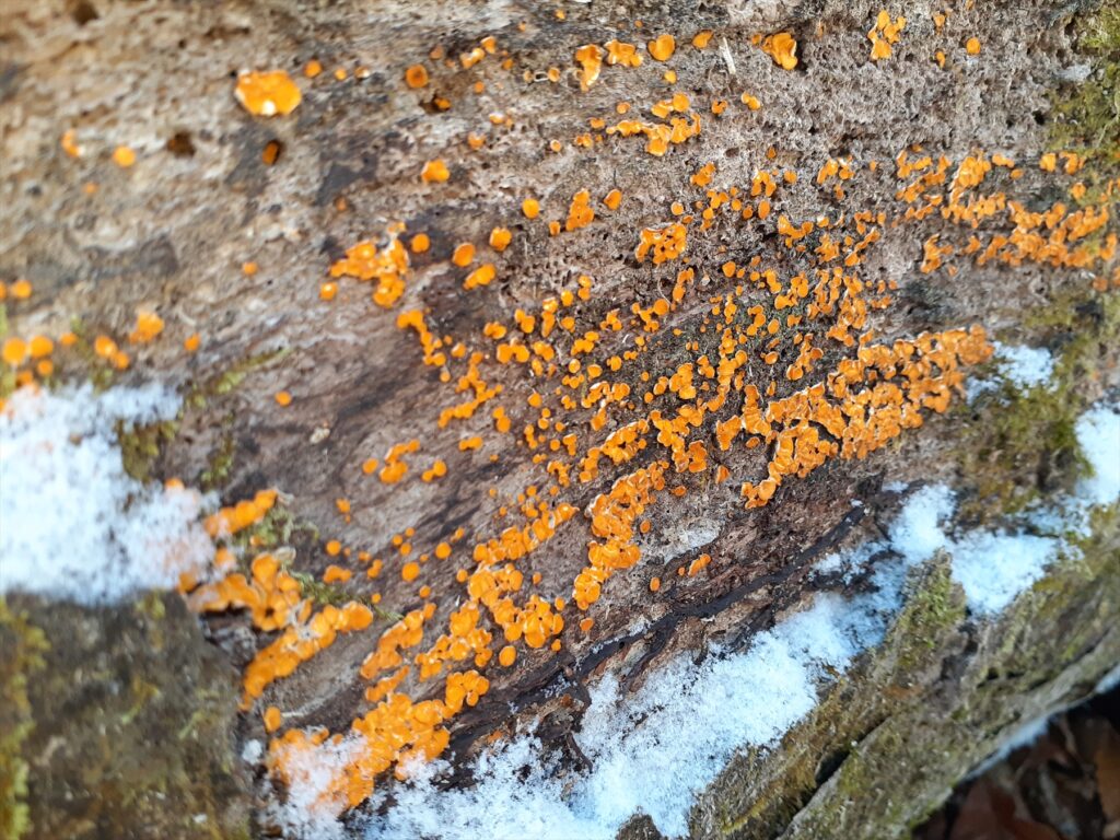 鮮やかな橙色が美しい小指の先ほどの小さなきのこです。とても小さいですが、集まっているので目を引きます。