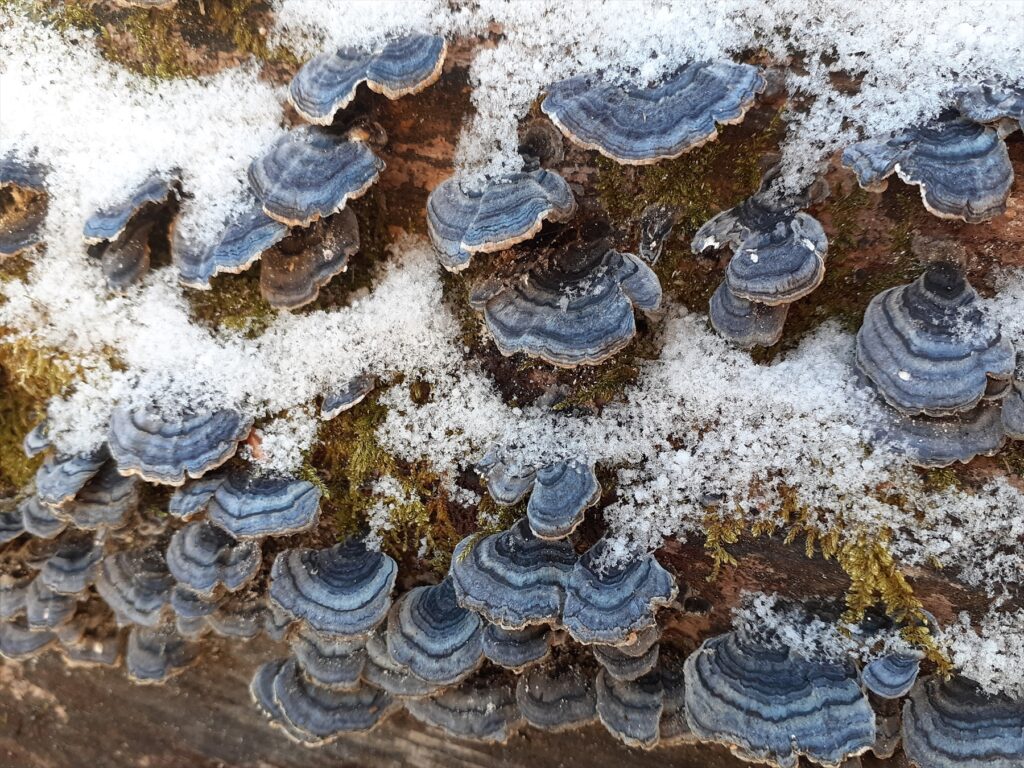 カワラタケというきのこは同じ種類でも色の違いがあり、様々な表情を見せてくれます。黒いものが多く、重なっている見た目から瓦にちなんでつけられた名前ですが、一か所に多く集まる姿がフリルのようで、上品なドレスにも見えます。