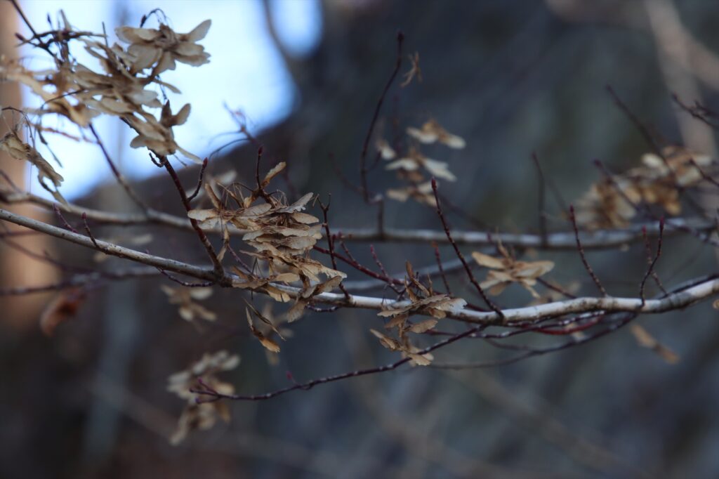 枝先に小さなプロペラのようなものが重なっていますが、これはカエデ類の種子。