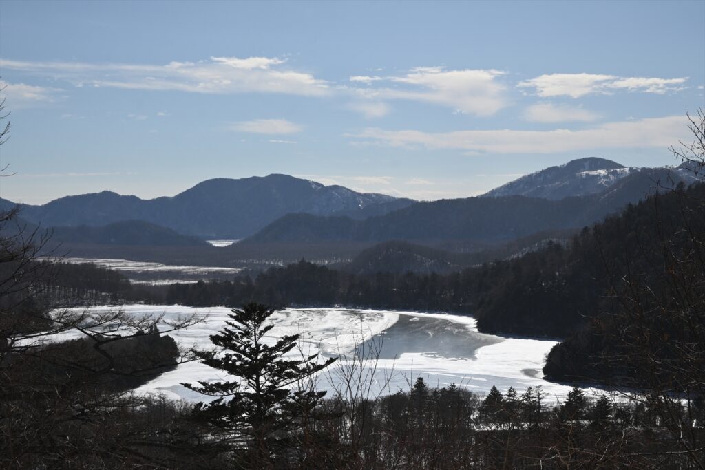金精道路を下っていく途中では凍った湯ノ湖を一望することもできます。