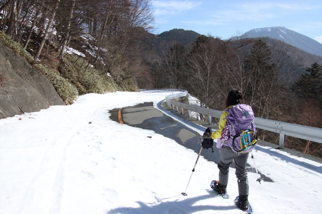 深いところでも雪が締まっているため沈んで足が取られるような場面はありませんでした。ですが雪が少ないからこそ、出ている岩や枝などにお気を付けください。また、金精道路では下の写真のように一部道路が露出している箇所もあります。