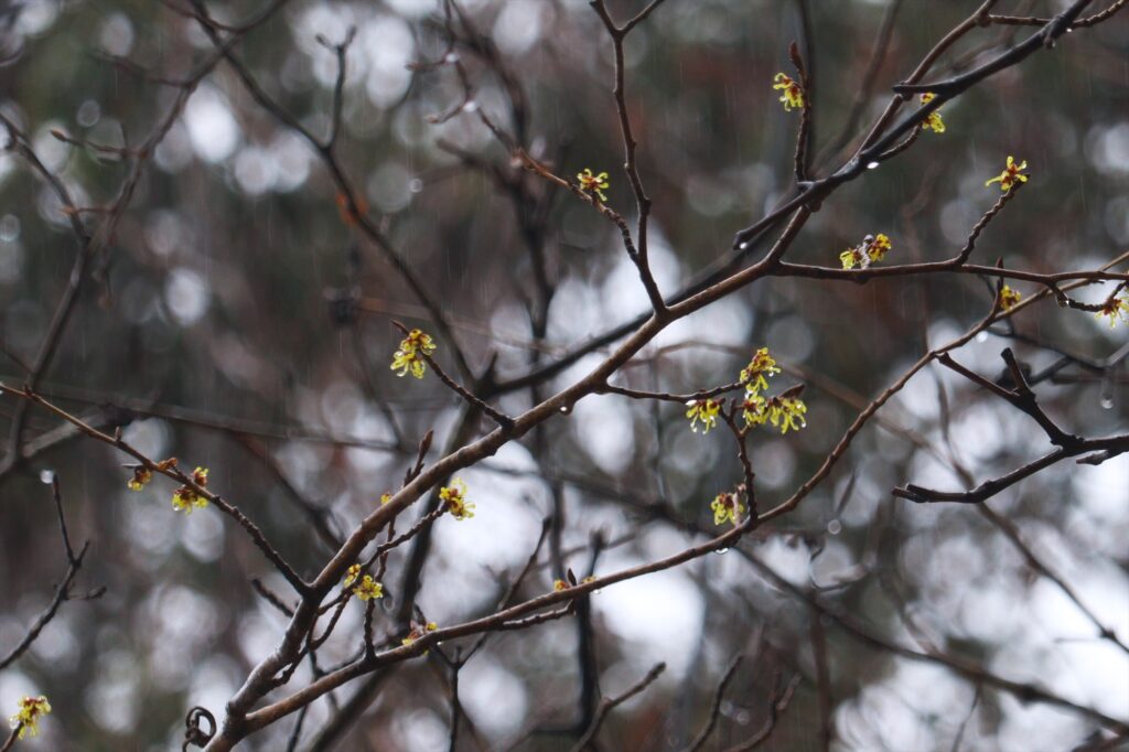 細長い4枚の黄色い花びらが、まるでくす玉の中から出てくる細長いテープみたいで面白い形!枯れ景色の中に黄色い花の集まりが見えたときは、取材で冷えた体が和らぎ、温かい気持ちになりました!