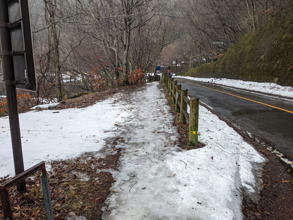 歩道は、一部氷が張って滑りやすいところがありますが、ほとんど雪が融け、地面が見えている状態です。