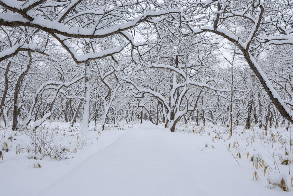 戦場ヶ原より奥は途中木道が2つに分かれます。木道の間を踏み抜きそうになったり、雪の重みで垂れ下がる枝に邪魔をされながら進むも、、