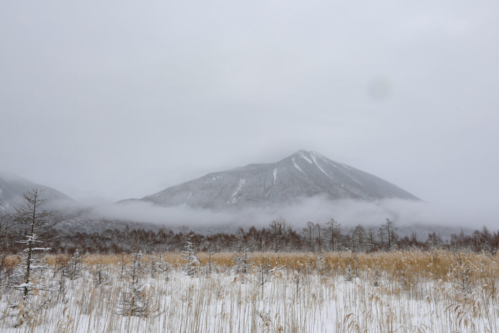 結局、光徳入口から普段の倍近い30分かけて戦場ヶ原に到着。疲れていたのもつかの間、目の前に絶景が広がります!!到着と同時に雪が弱まり、男体山の姿も拝むことが出来ました。
