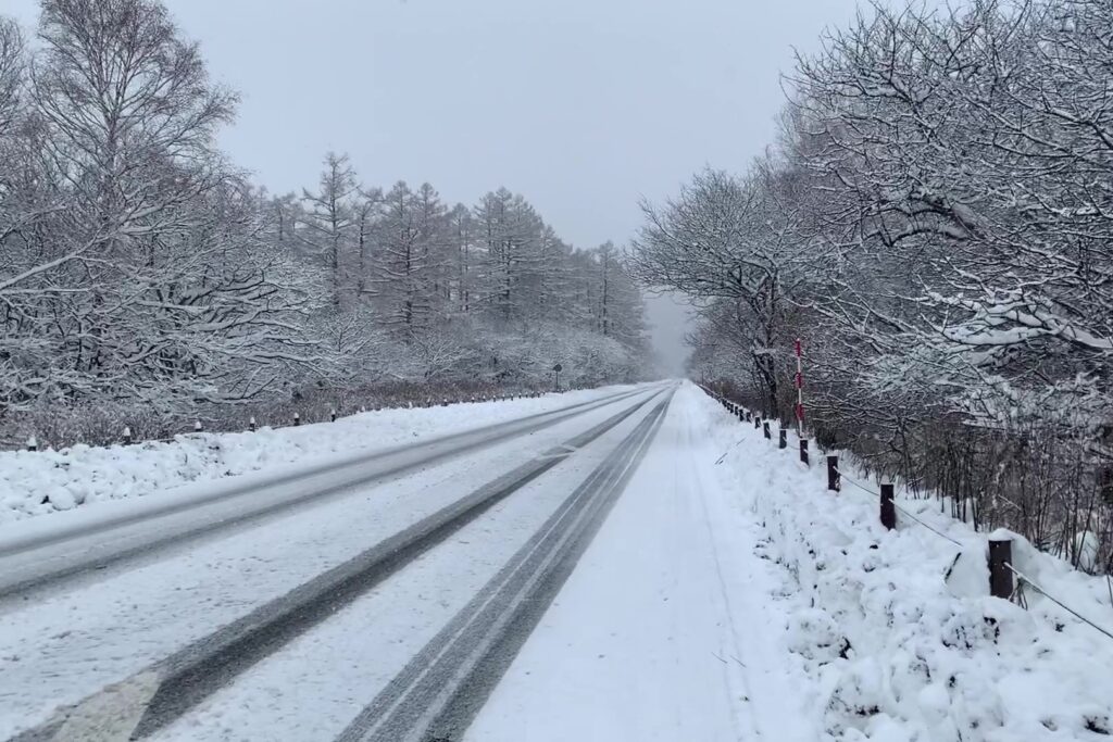 そんな大雪の中、今シーズン中々見られなかった綺麗な雪景色を求めて、北戦場ヶ原へ行ってきました。三本松Pから北戦場ヶ原の入口がある光徳入口バス停付近まで約20分間国道沿いを歩きます。(雪化粧美しい‼)