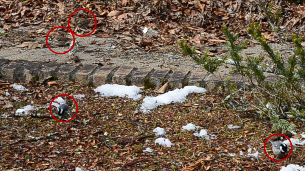 強い風で落とされた枝に集まり、枝についた実や落ちた実を探していました。枝に何度も飛び乗ったり、枯れ葉をひっくり返してみたりと忙しそうでした。動画では動く姿が見られるので是非そちらもご覧ください!