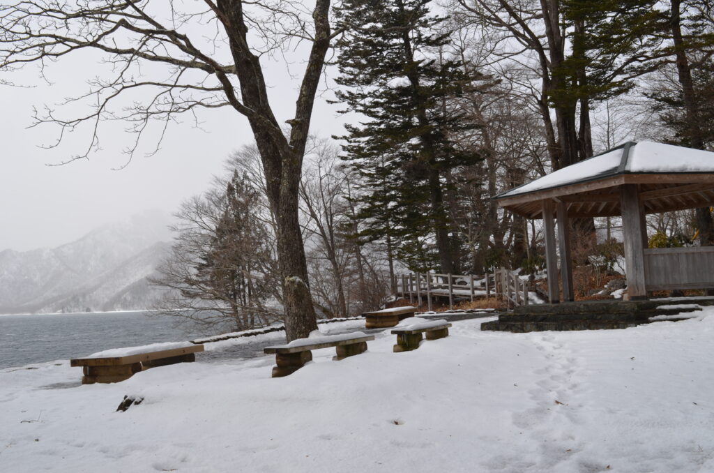 今回は日光自然博物館から湖畔沿いを歩き約30分、西六番園地まで行ってきました。スタート地点の博物館は……真っ白!