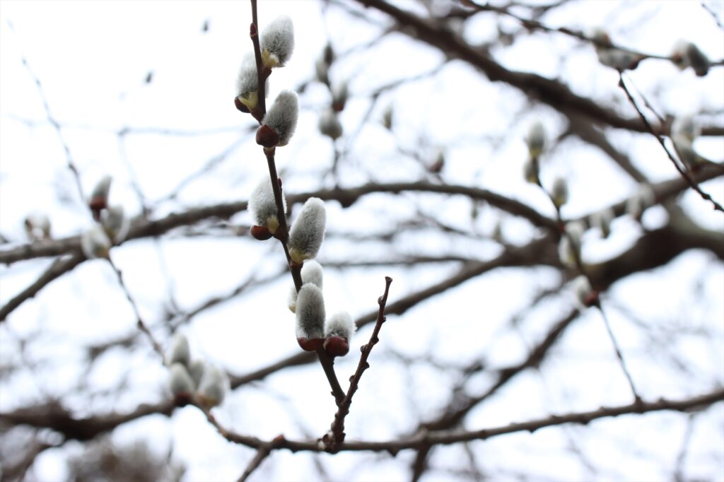 それはヤナギの花穂です。ヤナギは他の木々に比べるといち早く花を付けます。そのため、この銀色のフワフワがついている枝先を見るといよいよ春の訪れを感じられました。