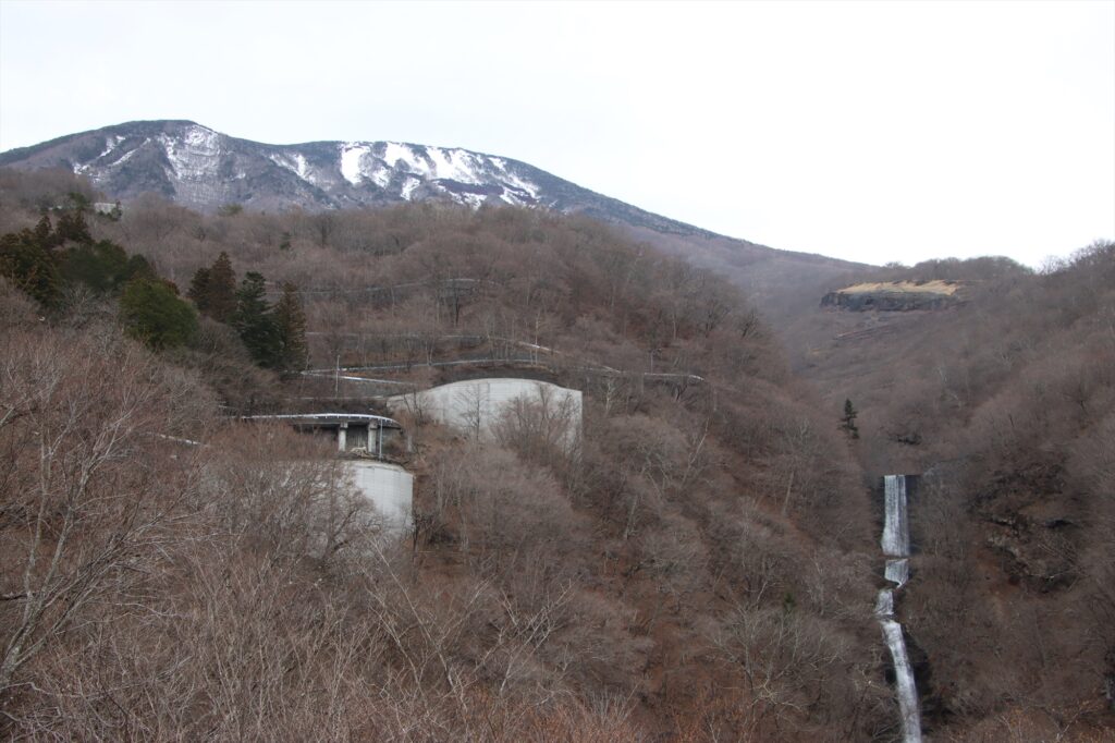 日に日に暖かくなってきた奥日光ですが、最初のカーブ付近では路肩に雪が残っていることに加え、まだ枯れ景色なことも相まって冬が抜けきらない様子。