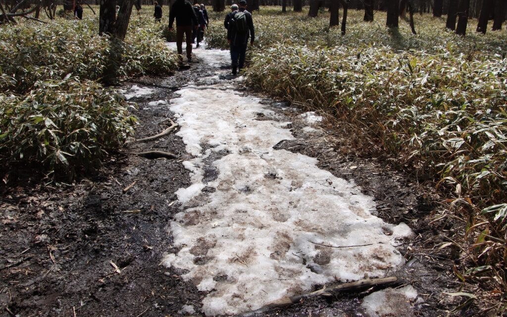 湯滝周回路では日陰では10センチ程度の残雪がありました。