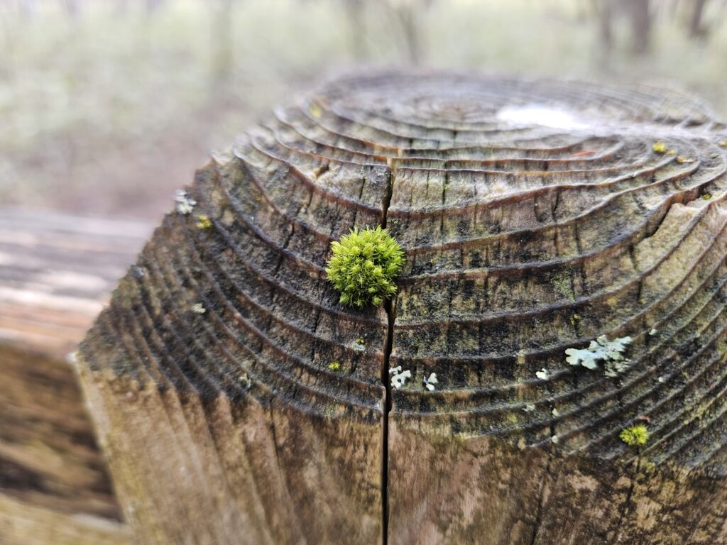 小田代原の木道の柵にはコケが生えることが多く、いろんな種類のコケがあるんです。今はコケたちも芽吹きの季節なので生えたばかりの小さくてみずみずしいコケたちが見られますよ。