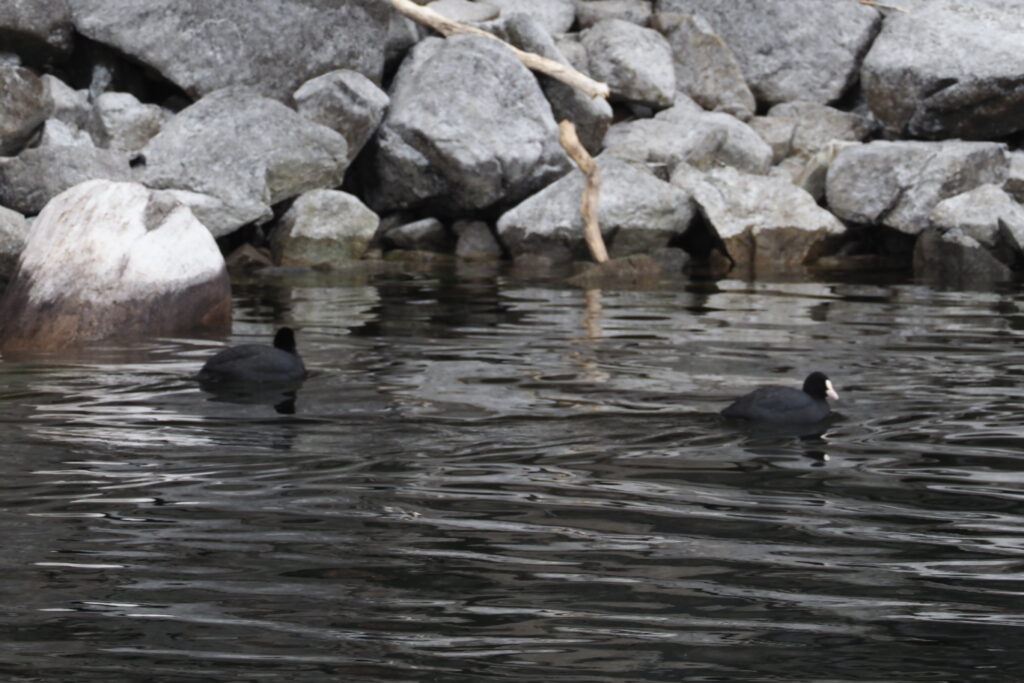 こちらはオオバンという鳥です。水に浮かんでいてカモのようですが、足には水かきがなくクイナの仲間です。奥日光には冬鳥として多く飛来しますが、まだまだ残っているようです。
