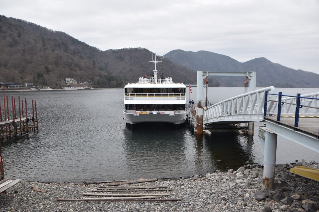 遊覧船に乗ると中禅寺湖から男体山や白根山などの山々を一望することができ、深緑や紅葉を楽しめます。今の時期は春が始まったばかりで葉がなく寂しい風景ですが、咲き始めたピンク色のアカヤシオやヤナギ類の黄緑色の花がひときわ目立つ早春の奥日光の風景を見ることができます。