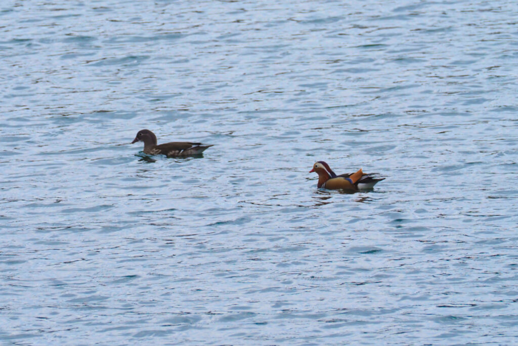 こちらはオシドリという水鳥です。奥日光には夏鳥として飛来してきます。デザインが奇抜なのがオスで、落ち着いた色合いの方がメスです。遊覧船に乗ると中禅寺湖を一周できるので、奥にいて歩道からは見つけることのできないオシドリも良く観察することができます。今回は3回ほど見つけることができました。繁殖に向けて、つがいで移動するオシドリを見ることができるかもしれません。