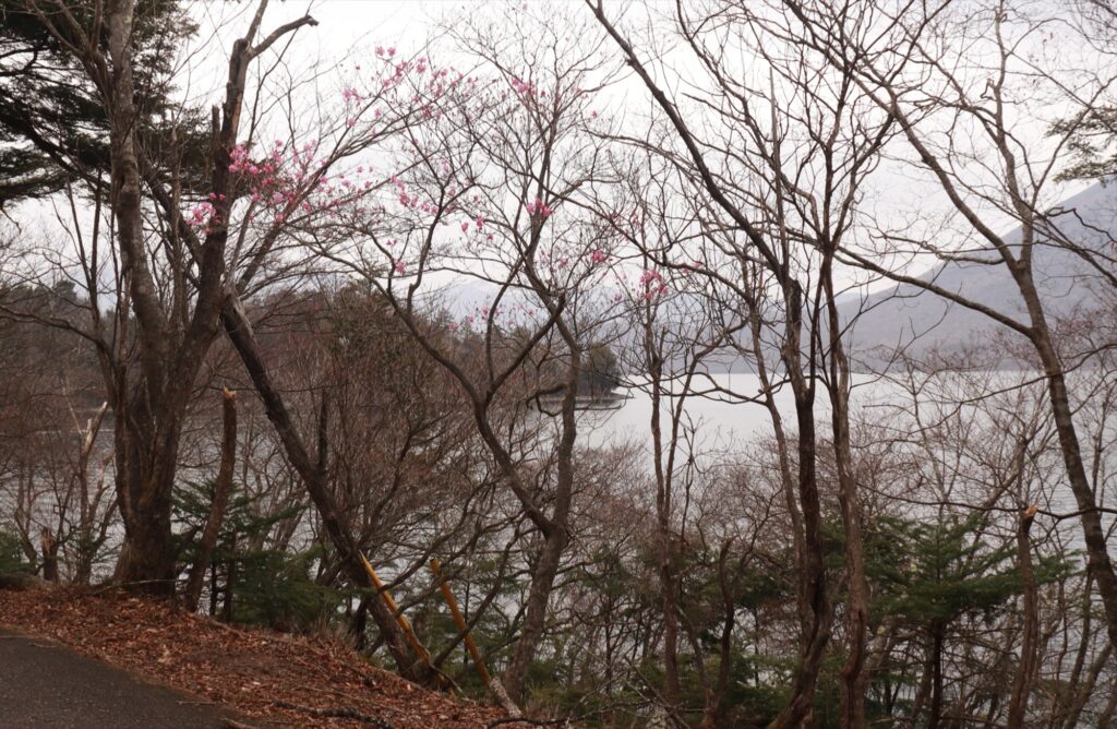 午前中に遊覧船に乗ってきたスタッフから南岸でアカヤシオが咲いていると聞き、さっそく様子を見てきました。