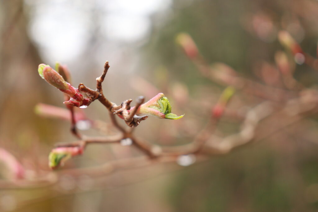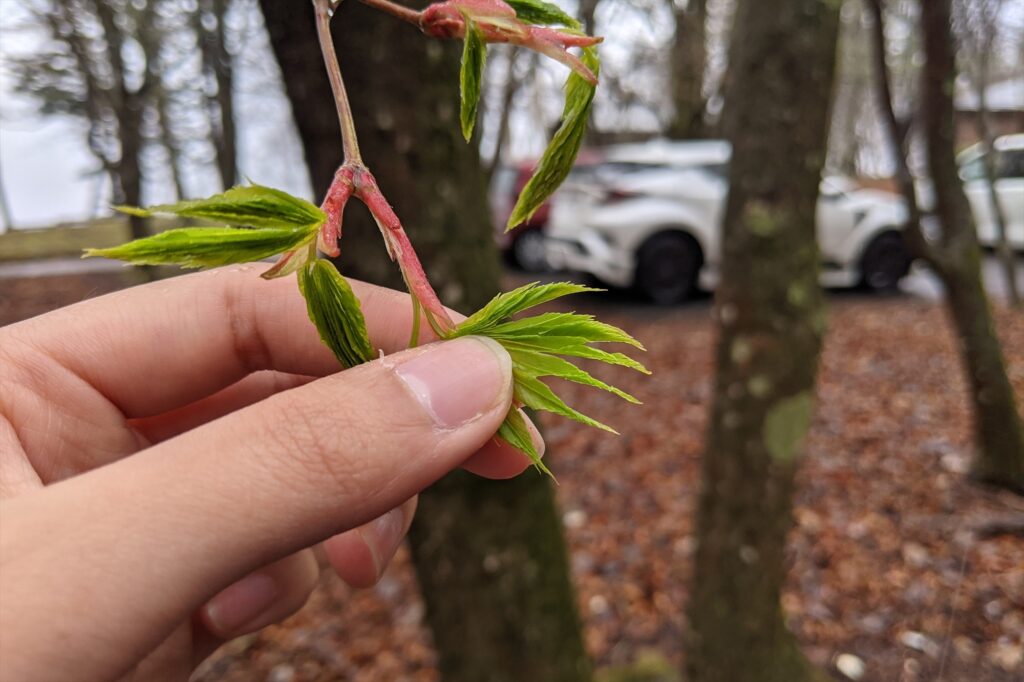 この時期のカエデ類の葉は人間の手のように葉の先が5~7裂にわかれた形ではなく、キュッと小さく小さく折りたたまれています。