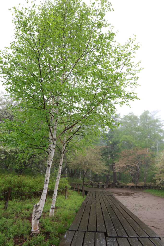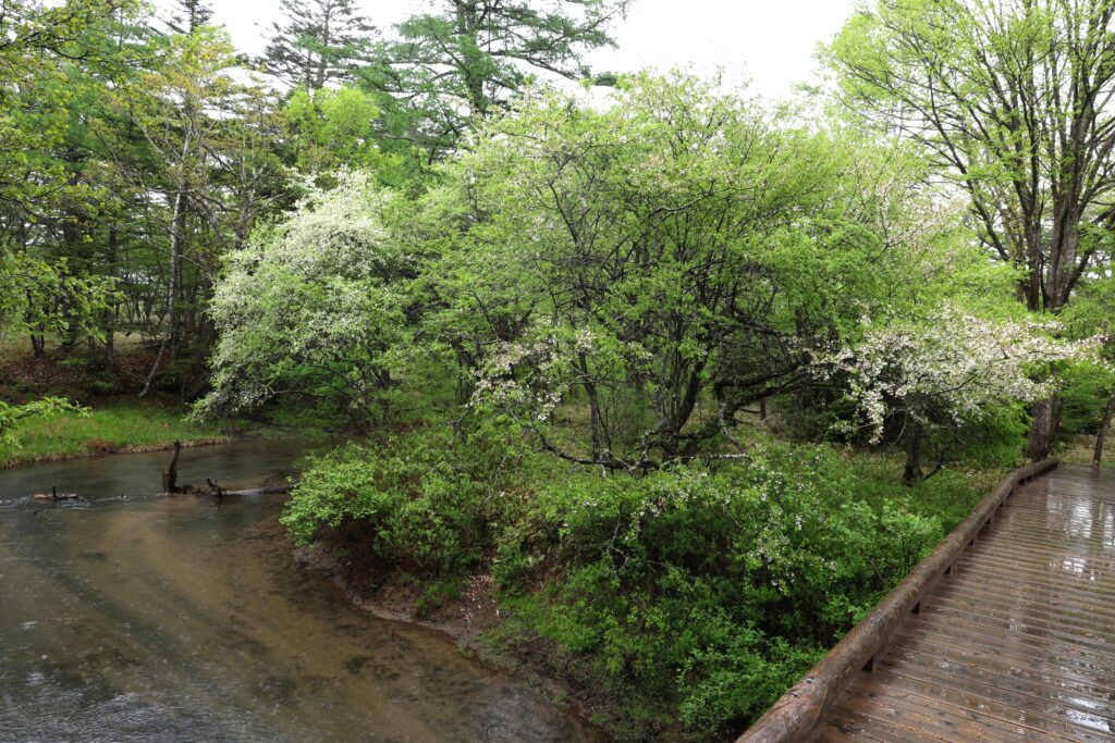 取材日の28日は本降りの雨でしたが、戦場ヶ原のズミの咲き具合を確かめるために、赤沼駐車場~青木橋間の片道約2kmの区間を歩いてきました。