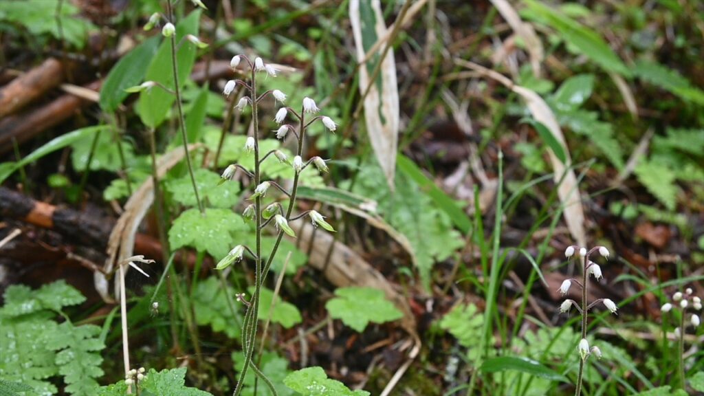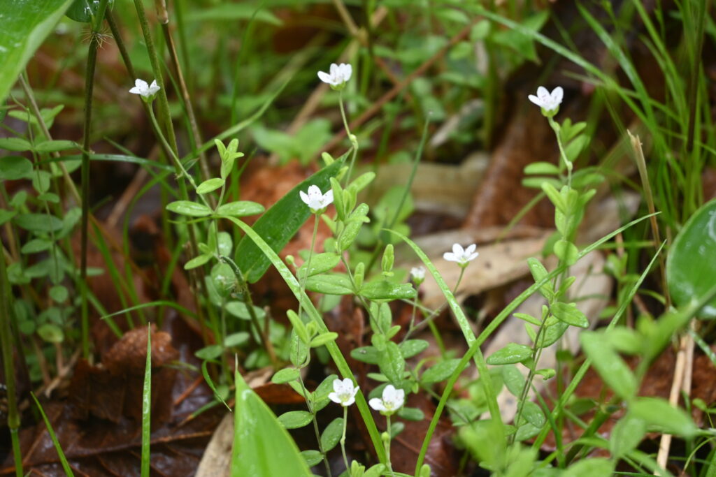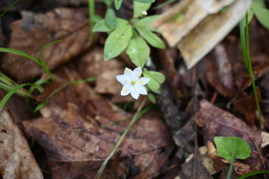 また、その中でより星のような形の花が咲いています。ツマトリソウといい、先の尖った白い花弁が七枚ある花です。この花、よく見てほしいんです!