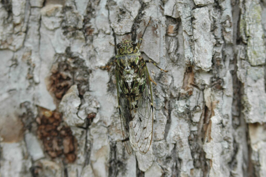 エゾハルゼミは名前の通り、春に出てきて鳴く緑色のセミです。こちらが別日撮影の成虫。