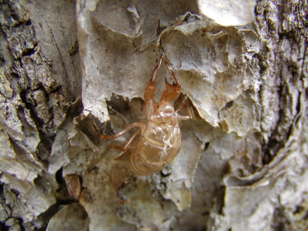 目にも殻がついていたという事が確かめられたり、この爪で土を掻き分けて木を登ってきたんだなぁなど感じられたり、いろいろ発見があります。成虫は木の上で鳴いていることが多いので手のひらに乗せて観察できるのは抜け殻の特権ですね。