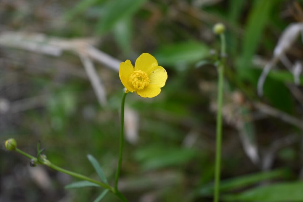 足元を見るとウマノアシガタという花が咲いていました。1.5cmほどの黄色の花です。もともとこの花は花弁に光沢があるのですが、雨の日はより艶やかに見えました。