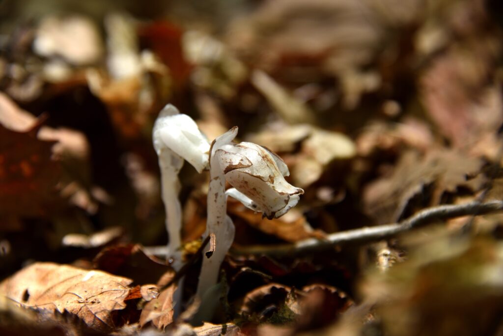 木の根元や落ち葉の隙間からニョキっと数本まとまって顔を出しているうえ、はっきりとした白色なので簡単に
