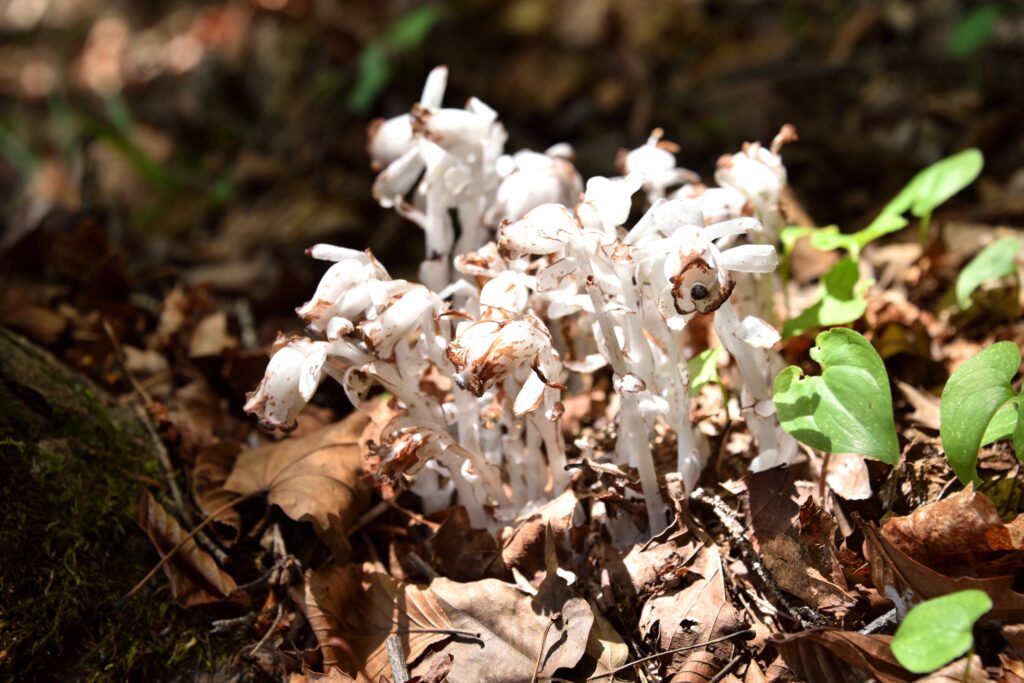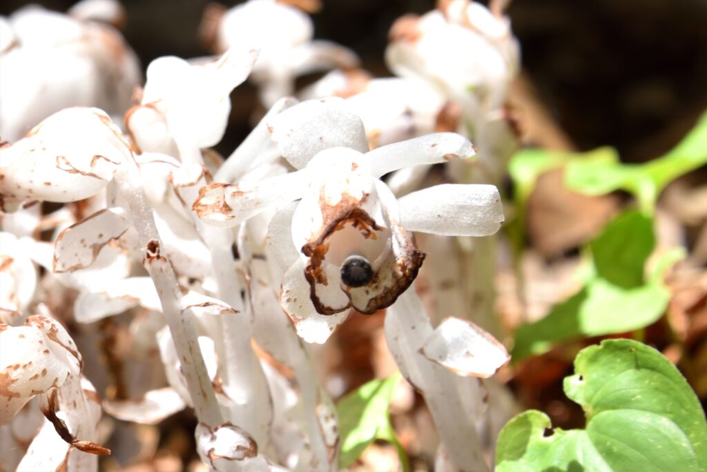 この真っ白なキノコのようにも見える植物は「ギンリョウソウ」