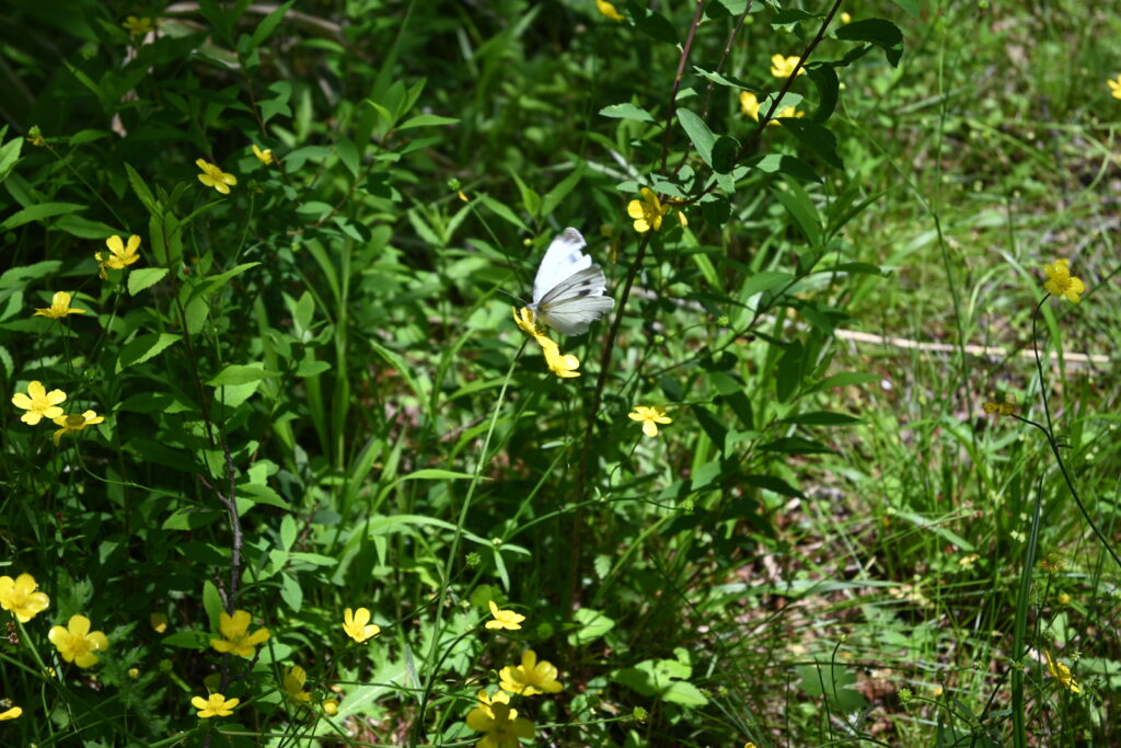 こちらはウマノアシガタとスジグロシロチョウ。ボロボロの翅でも一生懸命飛んでいました。